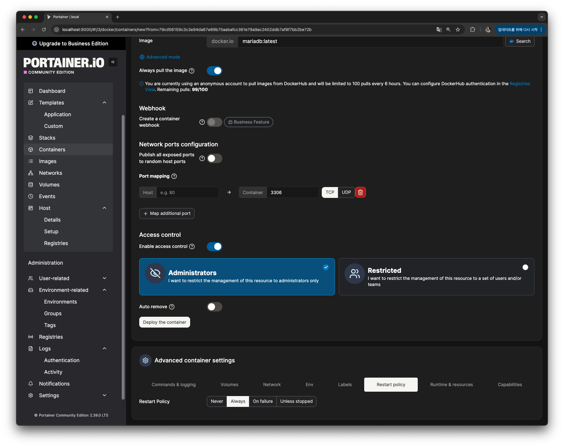 우선 하나의 도커 컨테이너로 자유롭게 배포가 가능합니다. (CE 버전 사용, BE에서는 더 많은 기능 지원 e.g. 그룹 권한 관리, Registry 연결 등..)